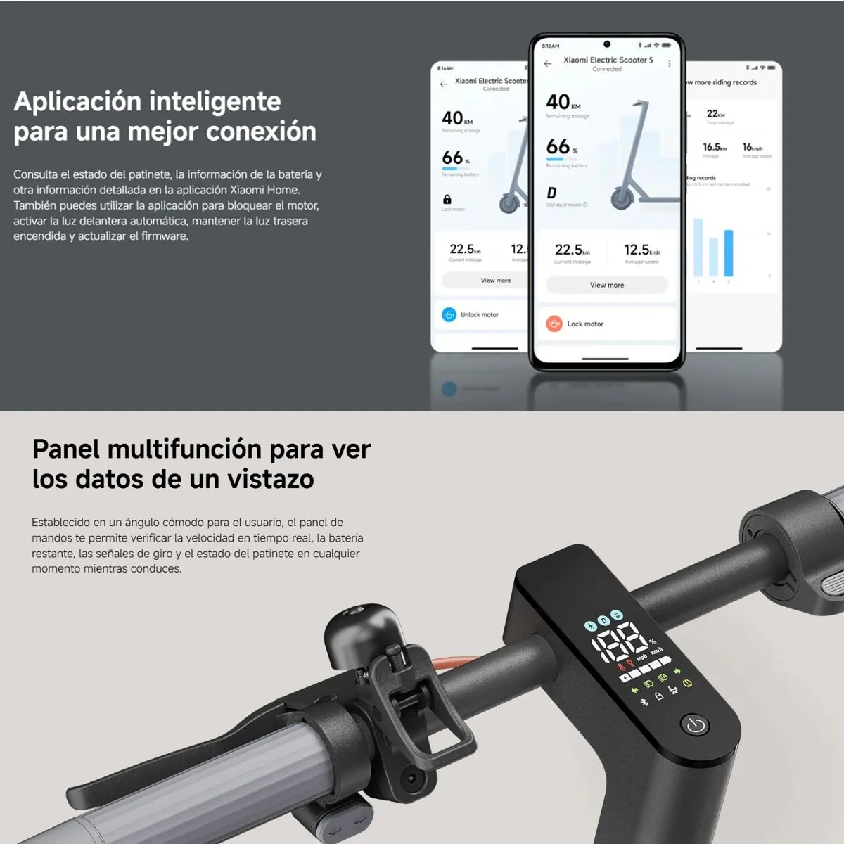 Establecido en un ángulo cómodo para el usuario, el panel de mandos te permite verificar la velocidad en tiempo real, la batería restante, las señales de giro y el estado del patinete en cualquier momento mientras conduces.